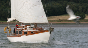 Long and deep keeled, she sits firmly and securely in a choppy sea, her true colours and racing pedigree not really apparent until the wind rises beyond 15 knots In a breeze with the wind on her beam she heals over, her helm neutral, and lieka Jack Russel she is away. When modern boats twice her size are struggling, she is in her element, cutting through the chop with 7 knots on the log .