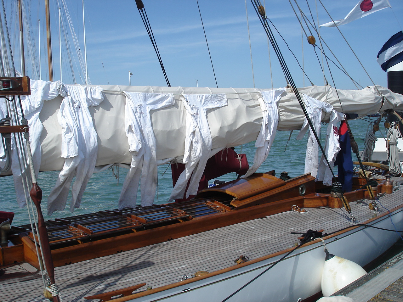 Kelpie's crew overalls dry on the boom as the fleet comes together again in the marina |